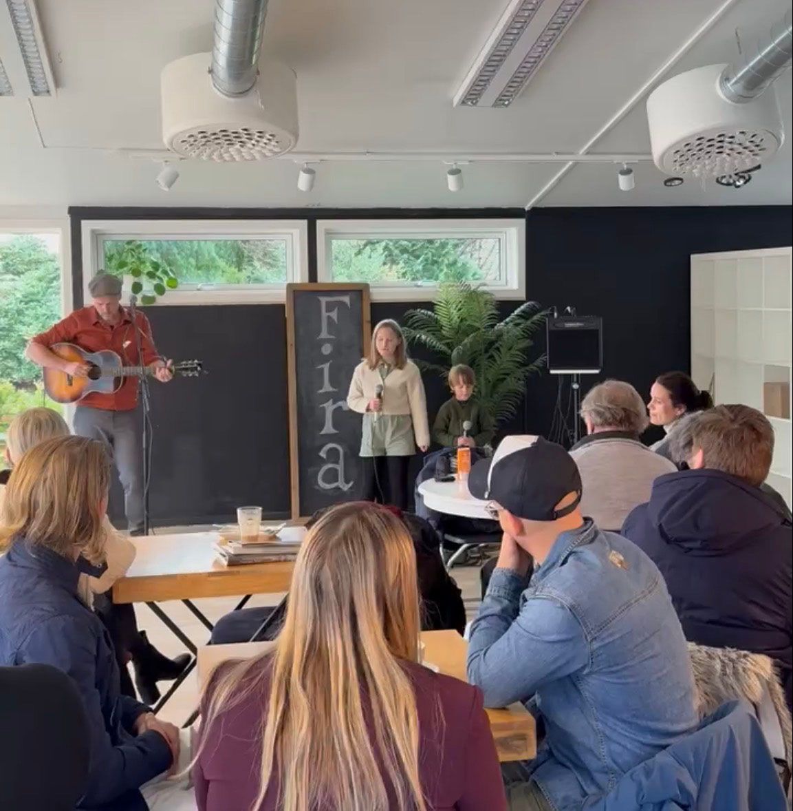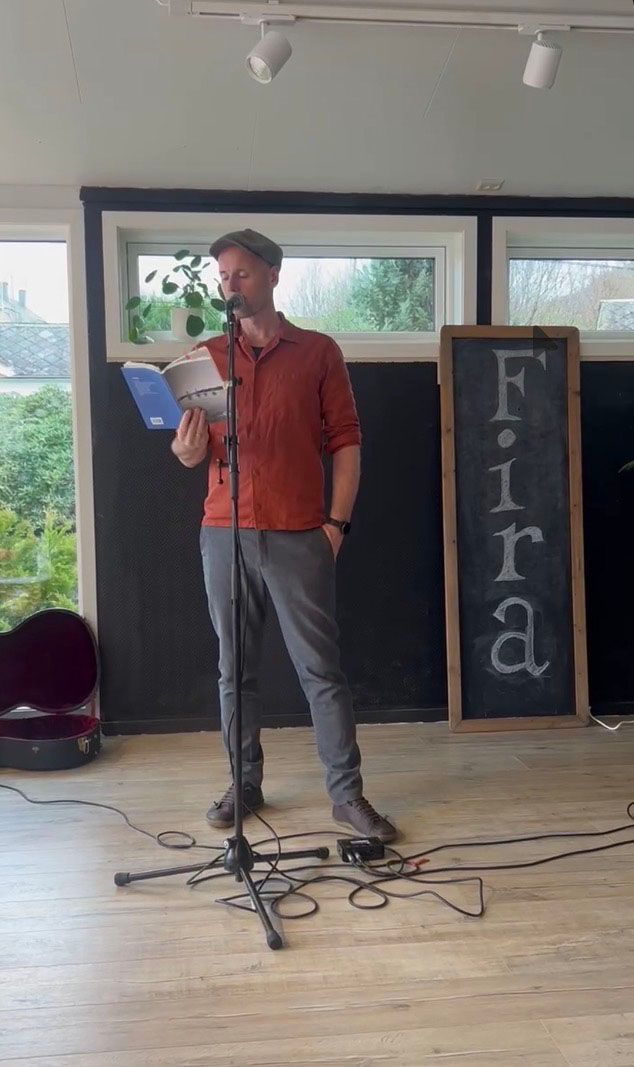 15. November slapp eg offisielt diktboka «F i r a» på svingen sine lokaler ved sida av Ivyelli i Våge. Då spela eg songar frå eige repertoar og las dikt frå boka. Det var tilnærma fult hus, og folk let velbåde om boka og arrangementet. Eg fekk signert ein del bøker, og eg sat igjen med ei god kjensle av fullført løp.