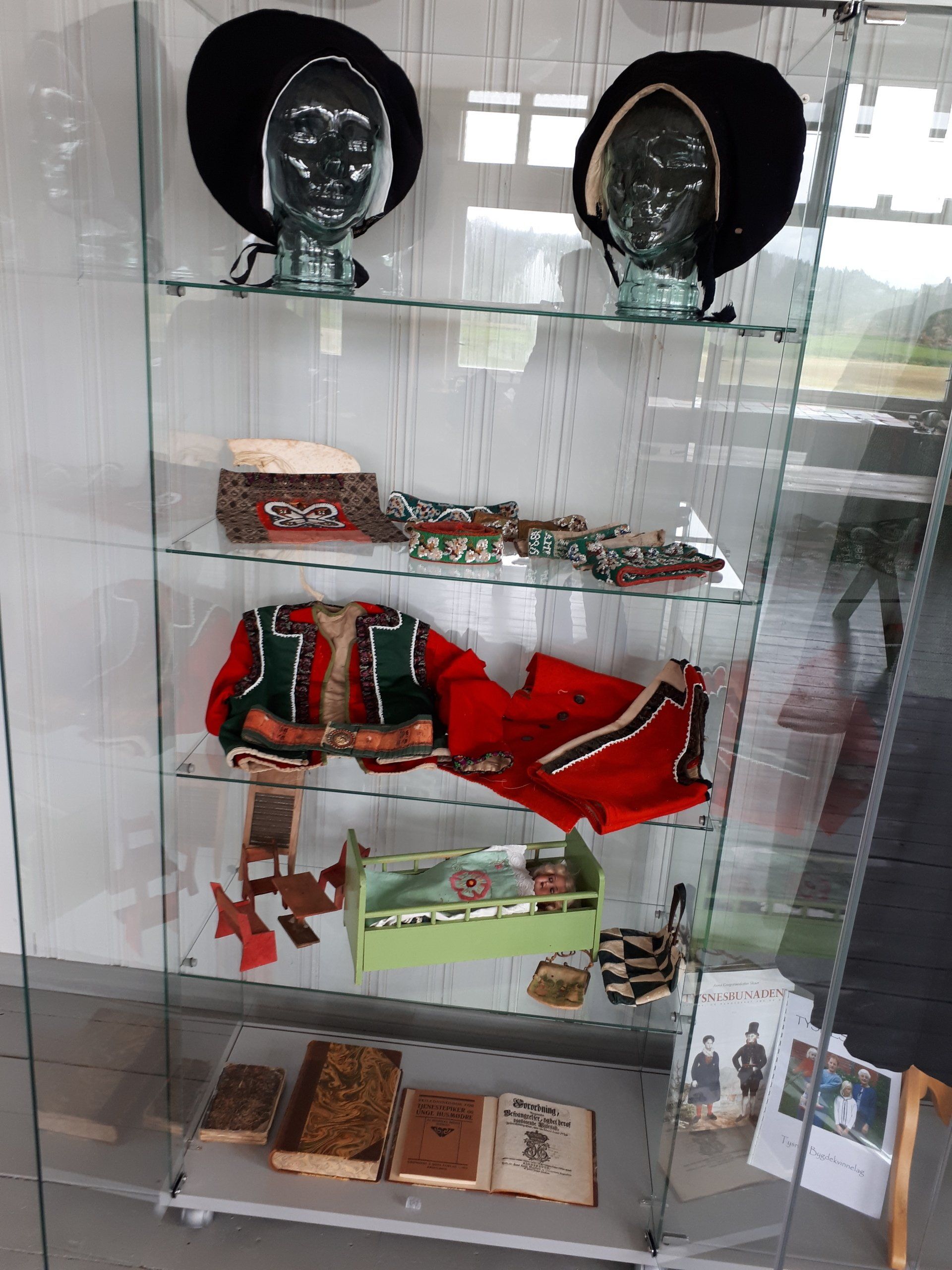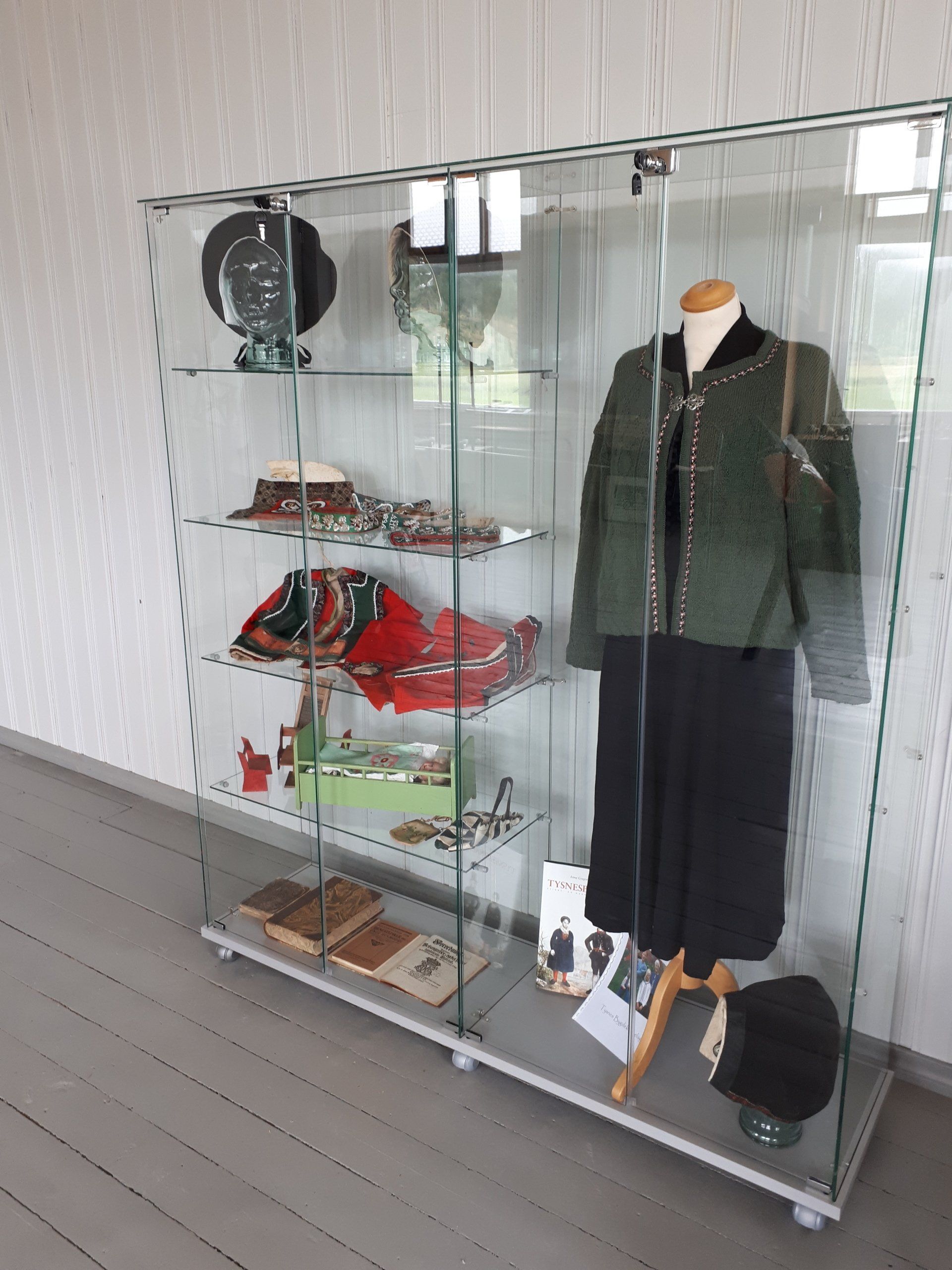 Då kan Tysnes Bygdekvinnelag endeleg syna dykk korleis gåva vi mottok i 2019, kr. 10 000, vart nytta. Saman med kulturmidlar frå Tysnes kommune, kr. 7 000, har vi kjøpt inn ein stor og rommeleg glasmonter og sett opp i "Tingstova" i det gamle tinghuset i Uggdal. Denne kosta vel kr. 16 000, slik at vi også fekk råd til å kjøpa tre glashovud, som nett no viser fram 3 Tysneshuer. Vi har fått gamle bunadsdeler frå Anna G. Skår, og desse stiller vi no ut i monteren, saman med dokkeseng og anna som Olav Skjellevik har kome med. I høgre delen kan de sjå ein fin modell av Tysnestrøya, den låner vi til utstillinga frå Tysnes kommune. Modellen har fått på bestekjolen til mormor mi, Marta Gurine, f. Amland. Marta gjekk på Sønnhordlands Amtsskole i 1913, då Tinghuset var nesten nytt. Til liks med fleire av medlemmene i Tysnes Bygdekvinnelag, har underteikna gått på Tysnes realskule i dette huset. " Tingstova" var klasserommet vårt i 2 år.