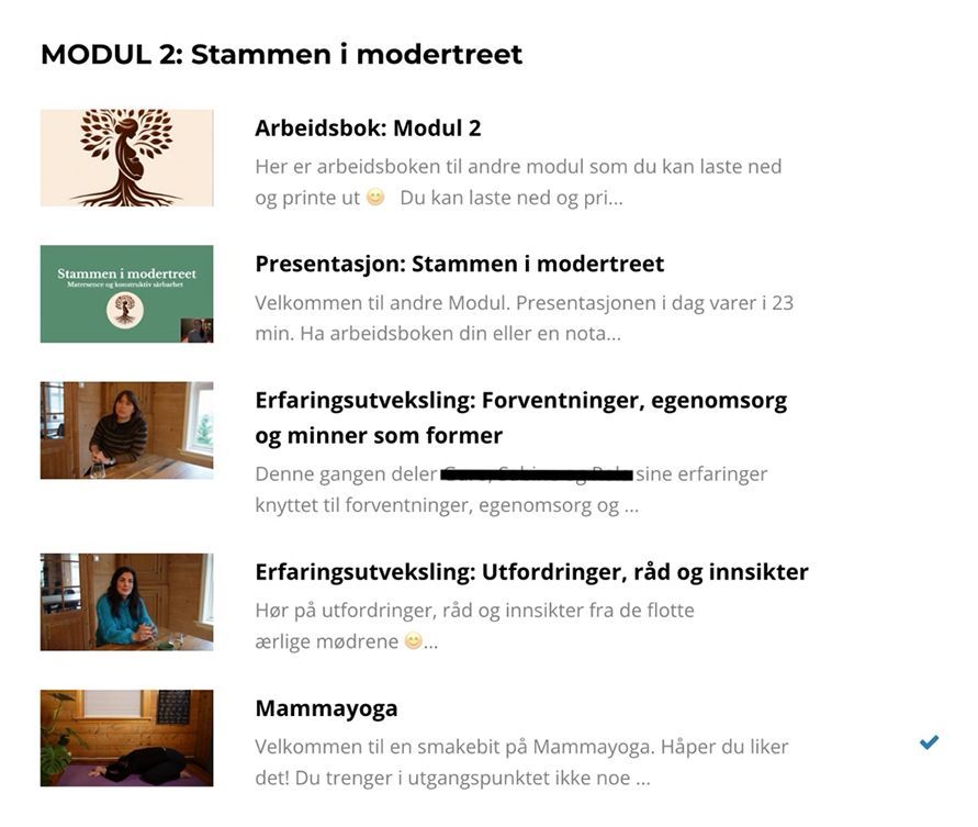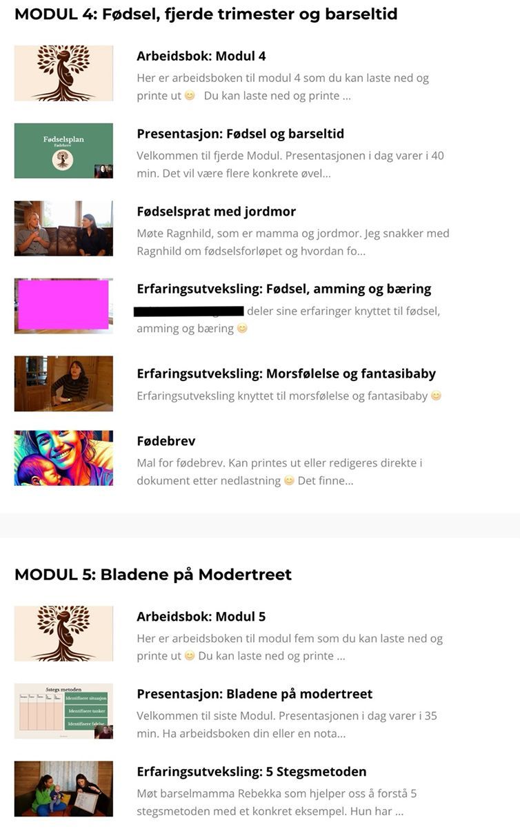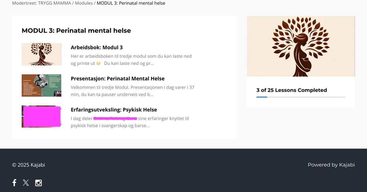 Det fysiske og digitale TRYGG MAMMA kurset er bygd opp med 5 modular. Eg har nytta kursplattforma Kajabi for å laste alle deler opp slik at klientar kan delta på kurset frå mobil, nettlesar og app. Eg har nytta kartlegging med Edinburgh postnatal depresjonsskår (EPDS)