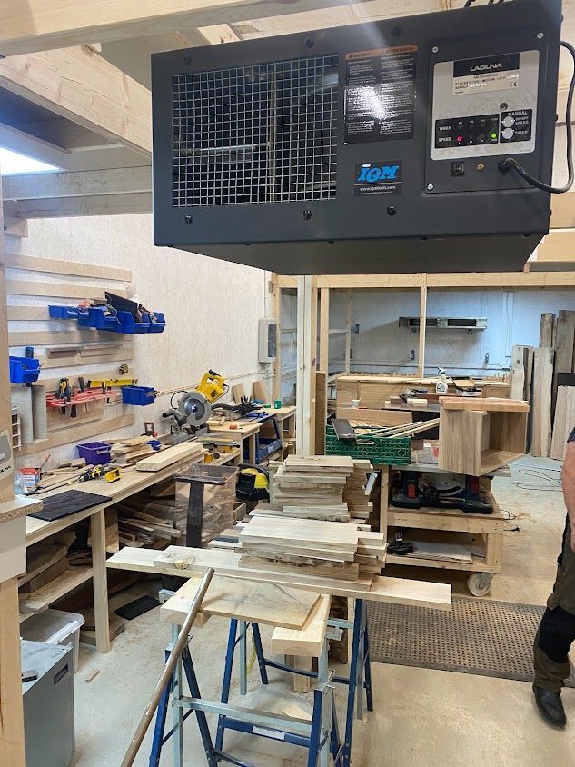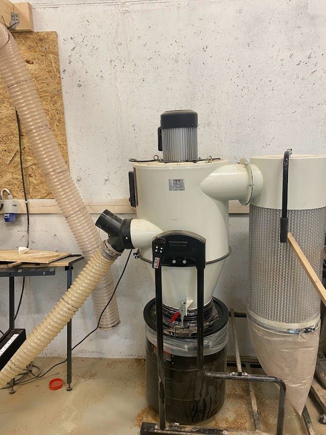 Spon og støv under trebearbeiding er ein stor synder og valgte derfor å gå litt utover budsjettet på denne investeringa. Det blei valgt ein maskin frå C.Dahm som kan handtere meir bruk med finere filtrering. Denne kan eg bruke på fleire maskiner samtidig og effektivt stoppe spon- og støvkontaminering av verkstaden.