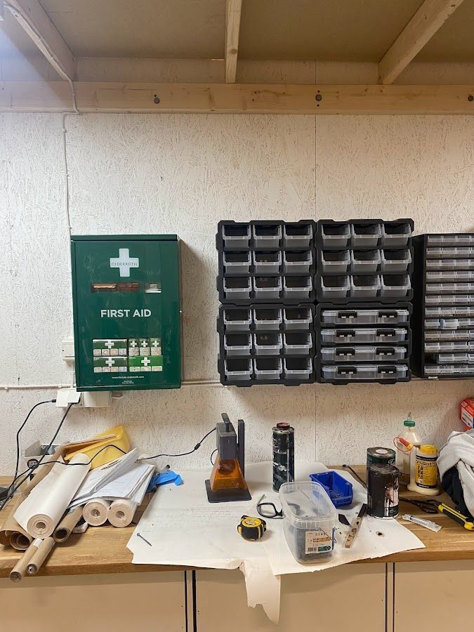 Det blei kjøpt inn eit godt rusta førstehjelpsskap med mykje innhald. Leverandøren brukt blei Kontorgiganten. Skapet vil vera godt synlig og plassert sentralt i verkstaden.