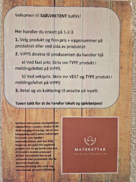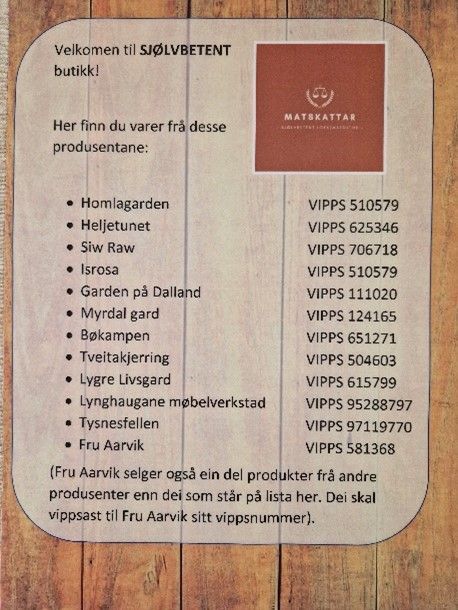 - Sjølvbetent lokalmatbutikk der kundar betalar med VIPPS direkte til produsent.
