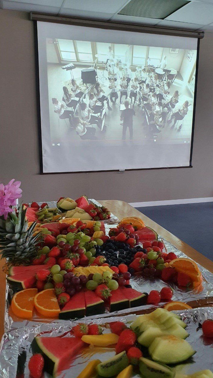 Deretter kjørte bussen oss til Sjø og Fritid for å sjå og høyre oss sjølv (og andre) spele på LIVESTREAM. Me hadde utdeling av korpsmedaljar (3,5,7 og 10 år i korpset) og så fekk me god mat. Skulekorpset fekk ein flott 2. plass i 3. divisjon med 93 poeng og er strålande nøgde med det.