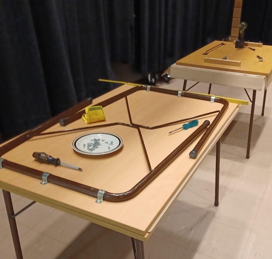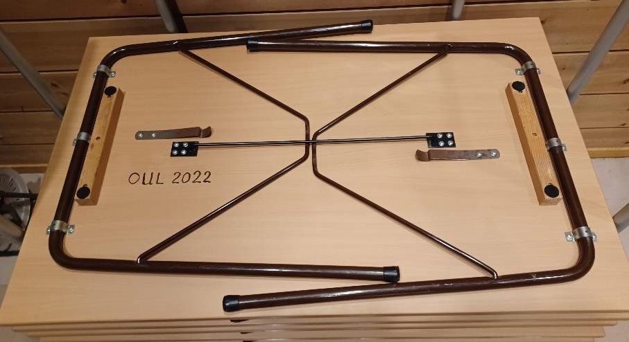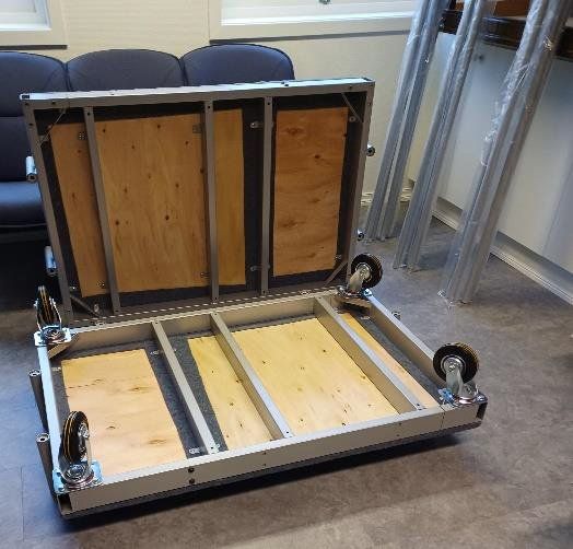 Bordvogner for skånsam lagring og intern transport. Desse skrues saman og merkes med instruks for bruk og sponsorskilt. No kan me lagra 2x20 bord på ein god måte og dette lettar transporten av dei, og lokala blir meir fleksible.