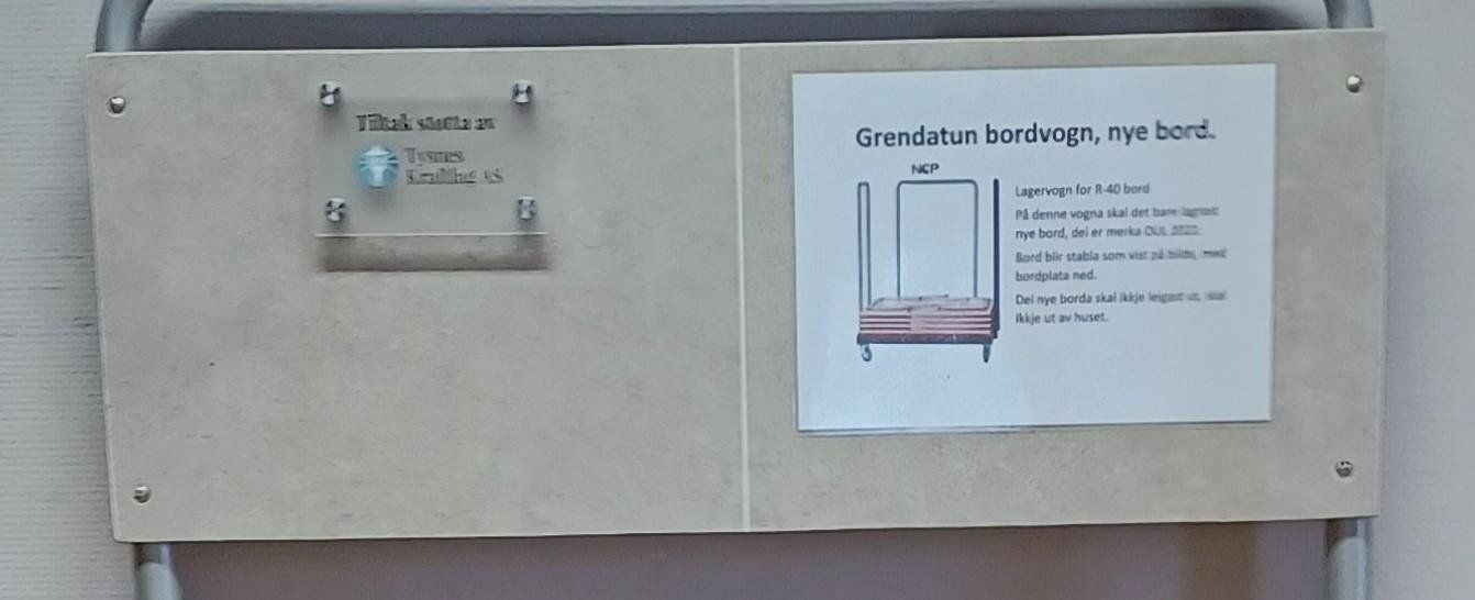 Bord, skifta ut skadde bordplater og lagre dei på transportvogner. 10 nye bord og 20 nye bordplater. Bordplatene blir montert på gamle bordunderstell. OUL har og kjøpt 2 bordvogner for skånsamare transport og lagring.