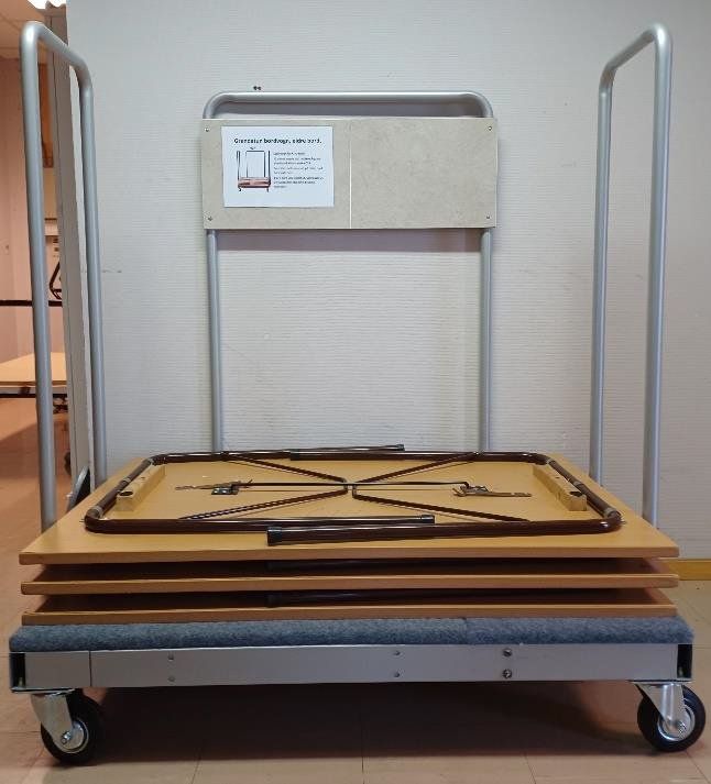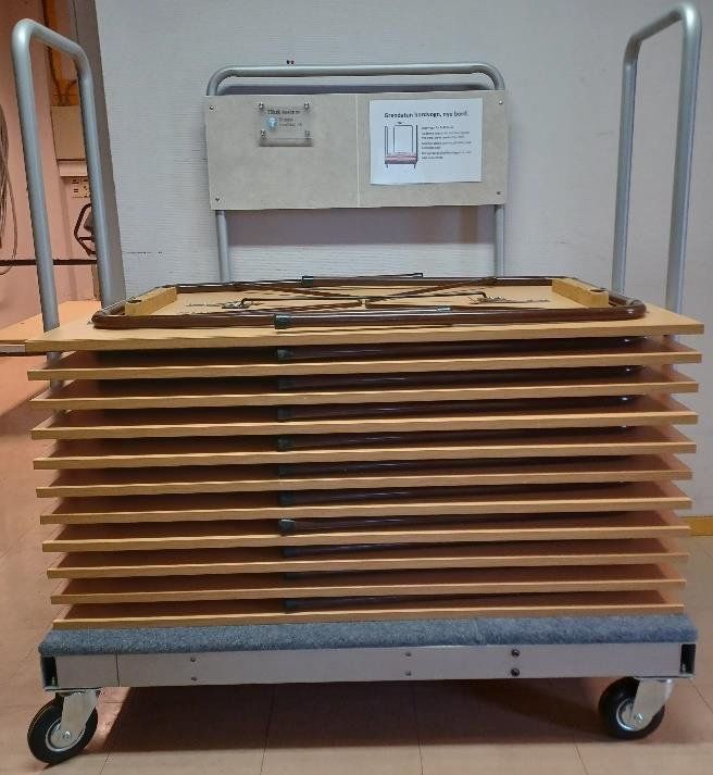 - Oppbevaringstralle Lars, brukas til borda, den rommar 20 bord stabla liggande. Bordet stablar godt med 5 cm i høgda pr. bord.