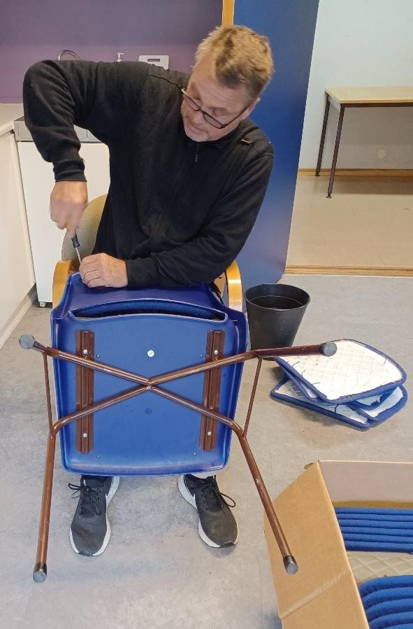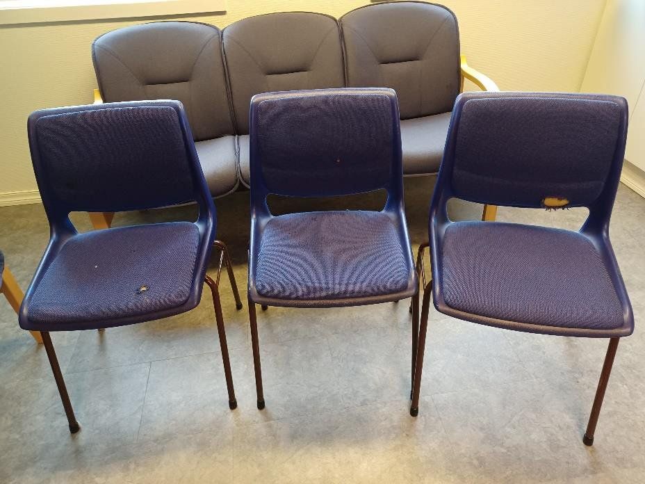 Den tredje dugnaden, skifte ut sete- ryggputer på 15 stoler. Eksempel på stoler med skader i sete- ryggputer.