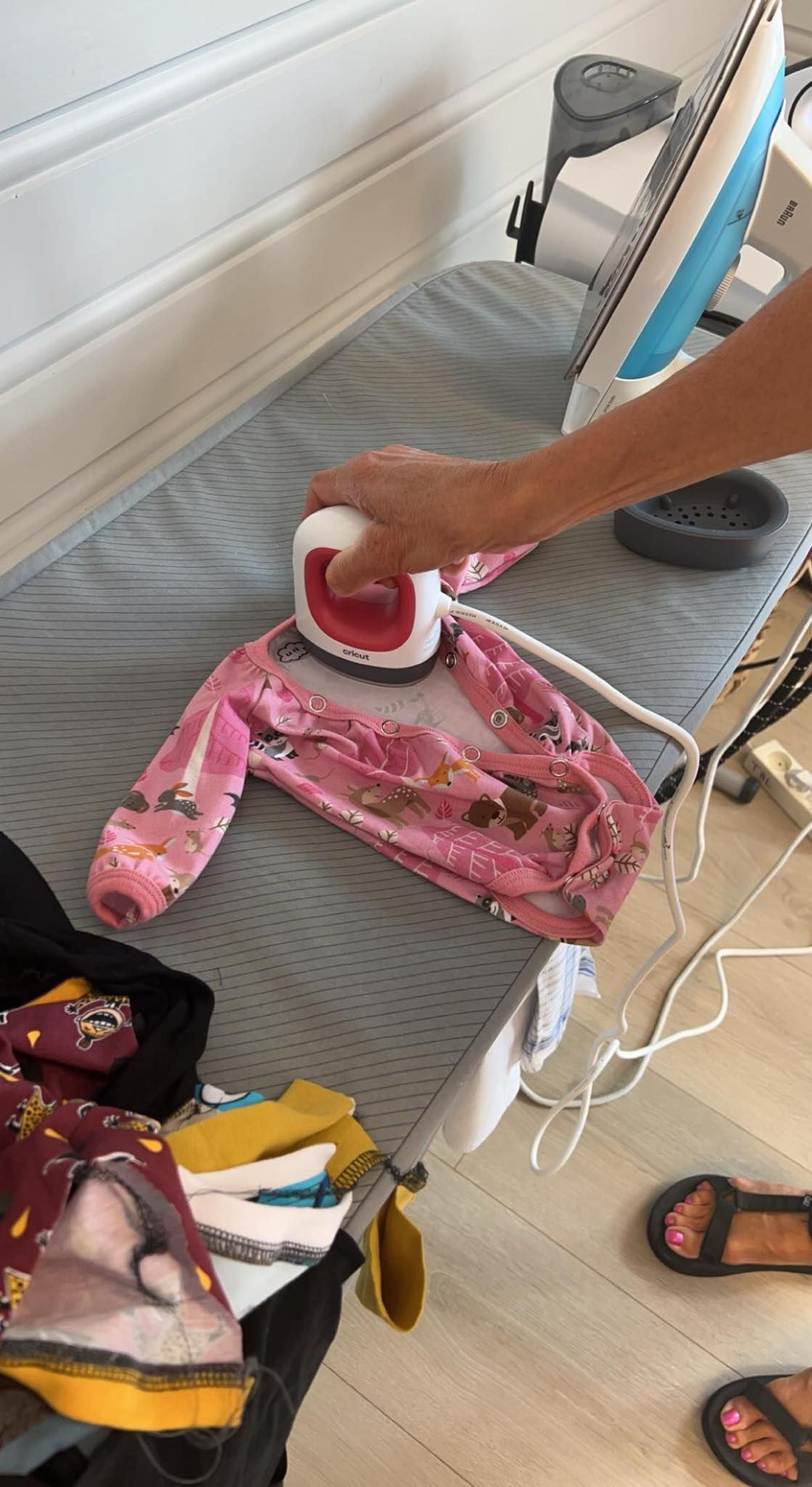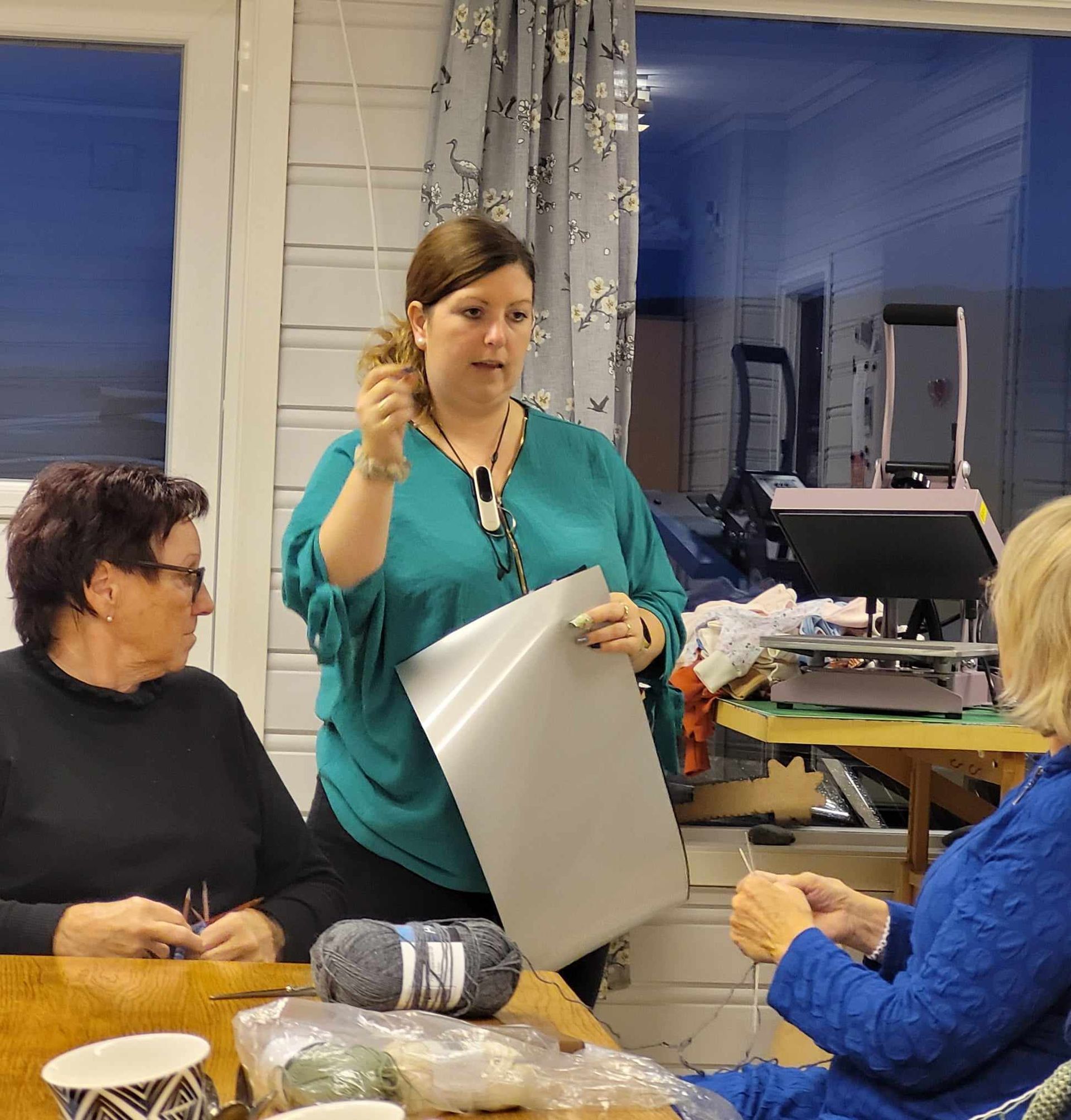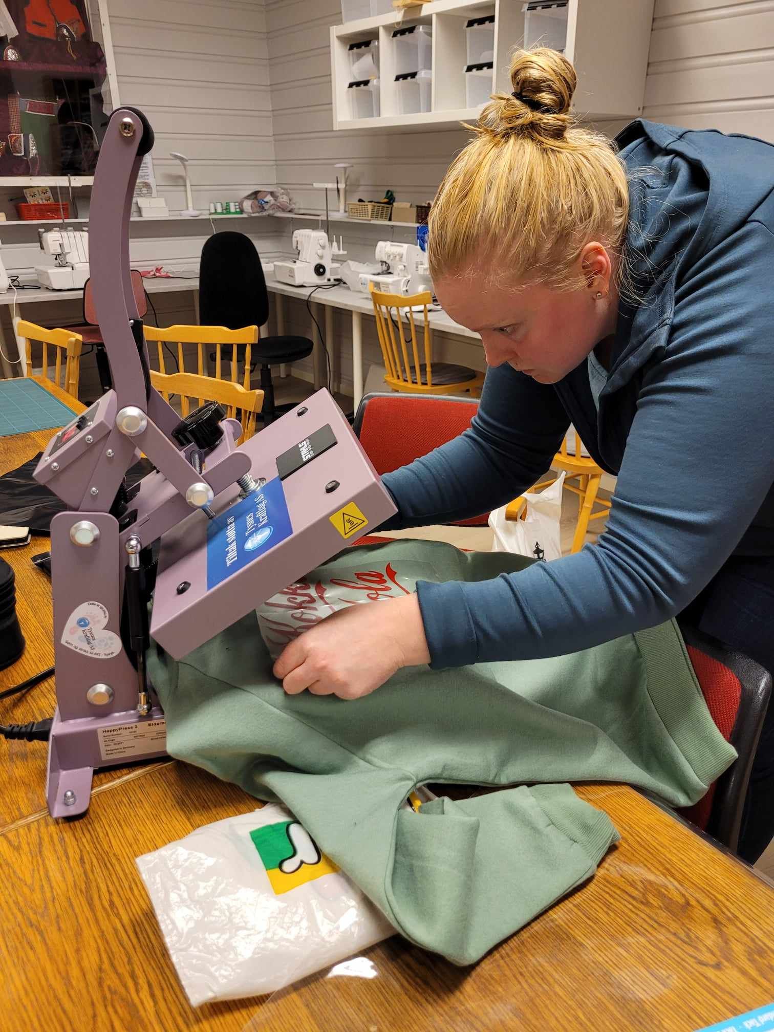 Treff i husflidsstova. Varmepresse, her er den lille utgaven me bruker til å merke kleda med rett størrelse