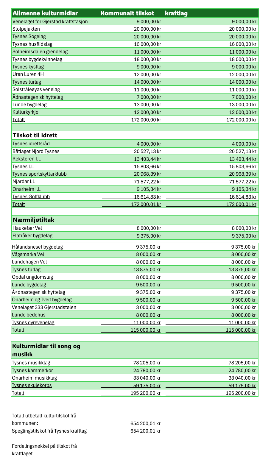 Tysnes Kraftlag spegler dei kommunale tilskota til idrett, kultur og nærmiljøtiltak for til saman kroner 654 200,01 for 2025.