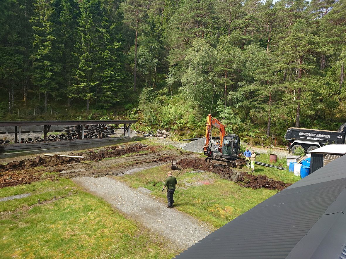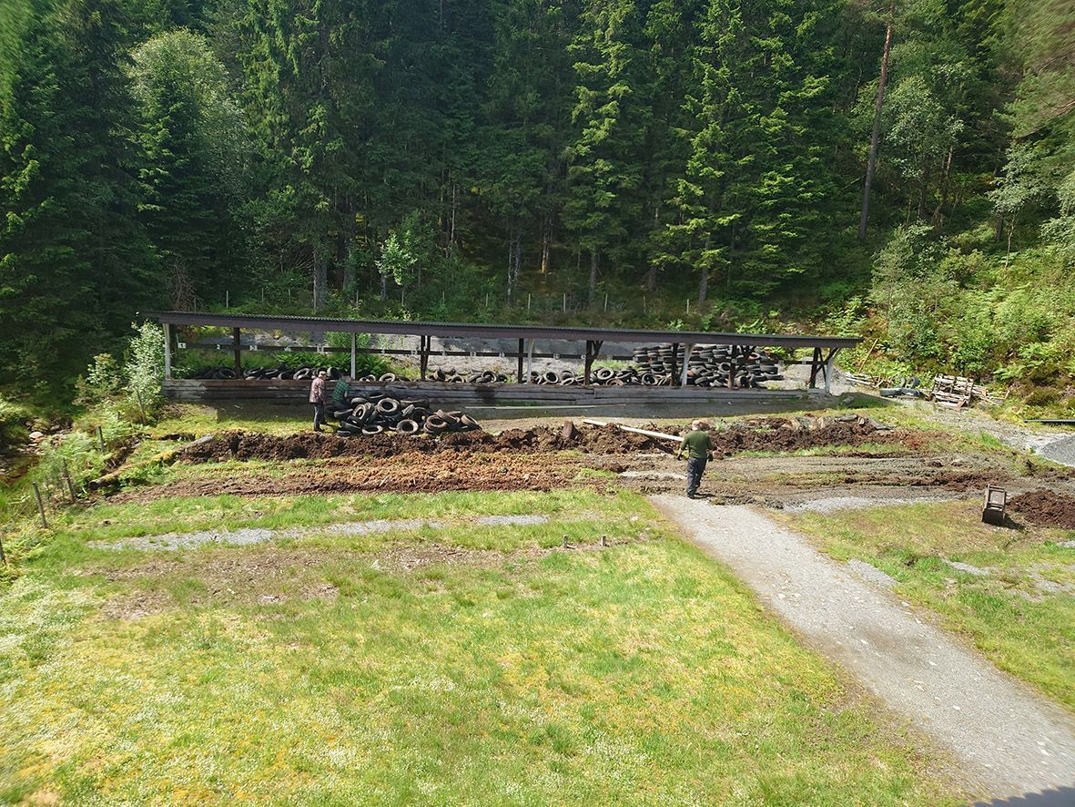Drenering, legging av duk og grusing av området mellom standplass og skivestativ. Laging av skivestativ og sokler til dette. Demontering av gammel benk, laging av ny ved skivestativ. Opplasting av dekk i nedslagsfelt på 25 meter. Inst. av varsel lys og wifi pga sikkerhet.