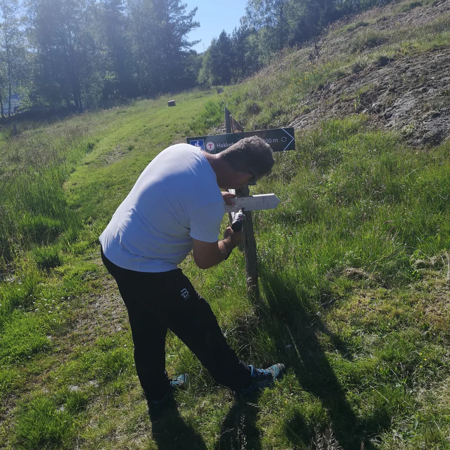 Me fekk óg støtte til turskilt til Nese/Kyrkjevarden på Neshamn, tre frivillige på 3 timar.