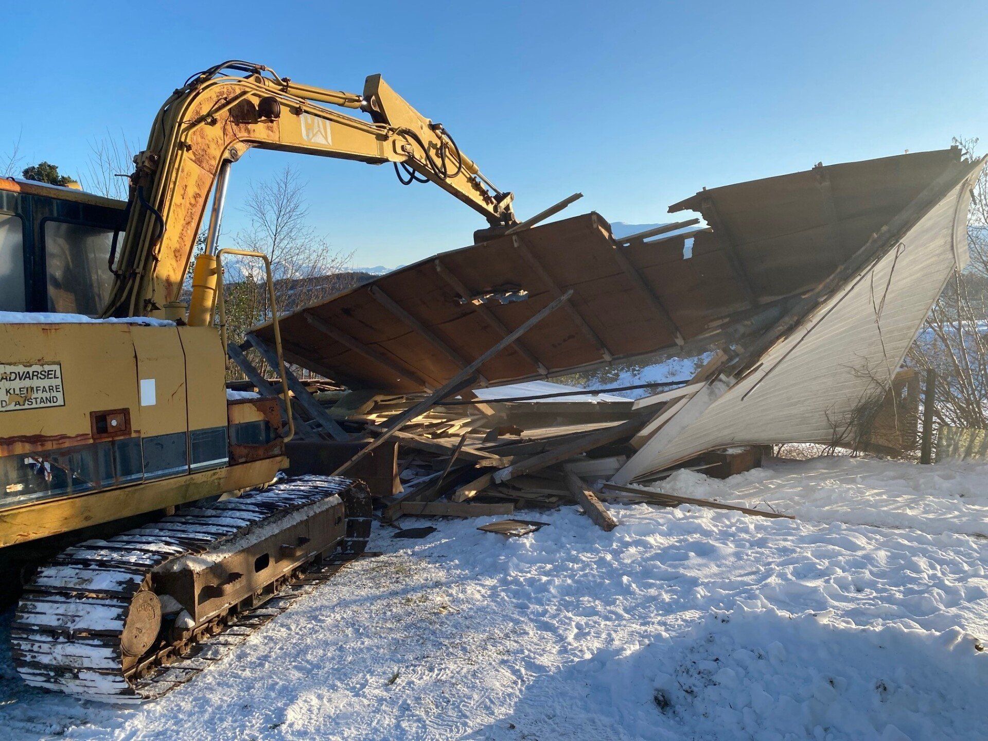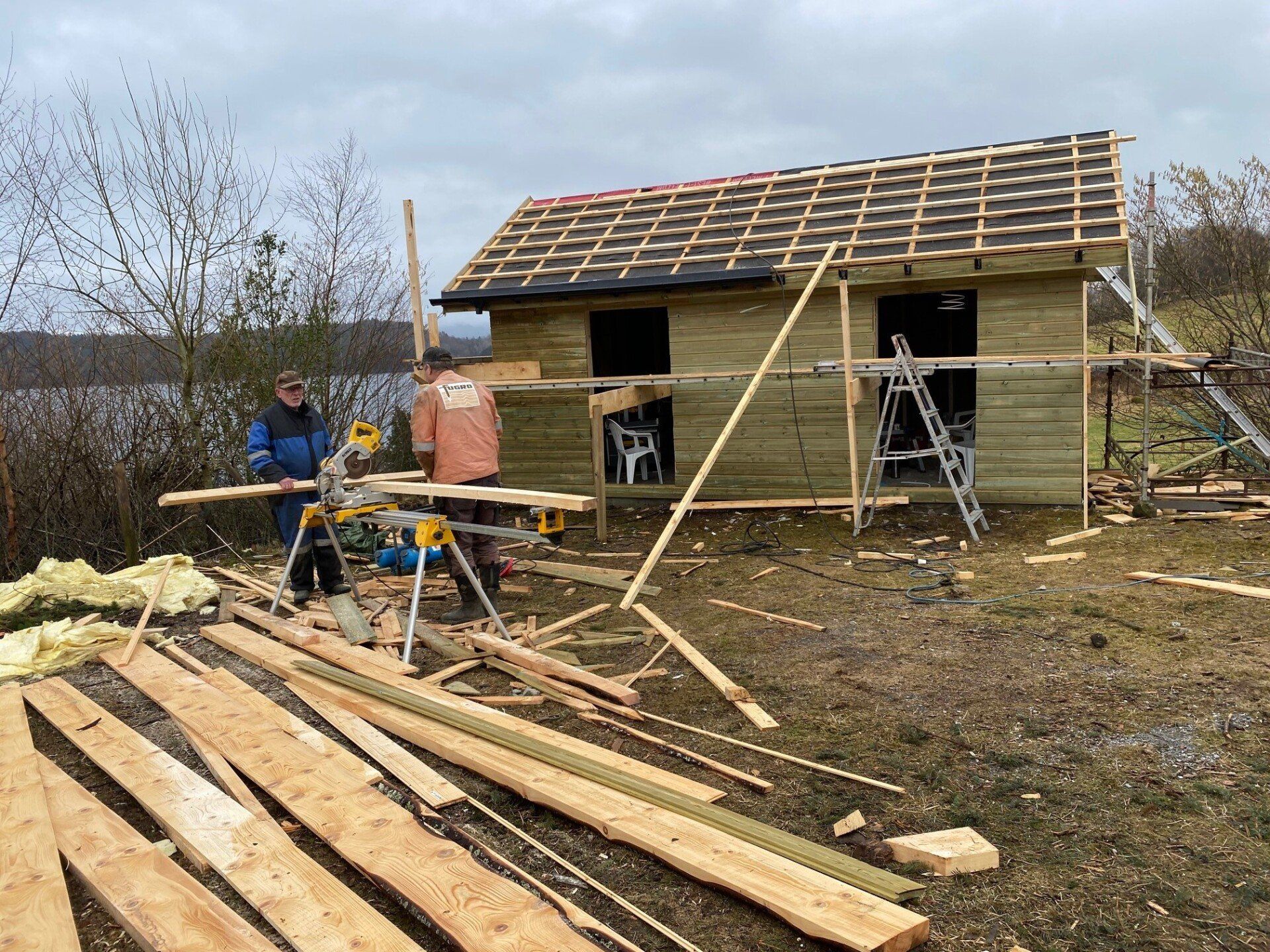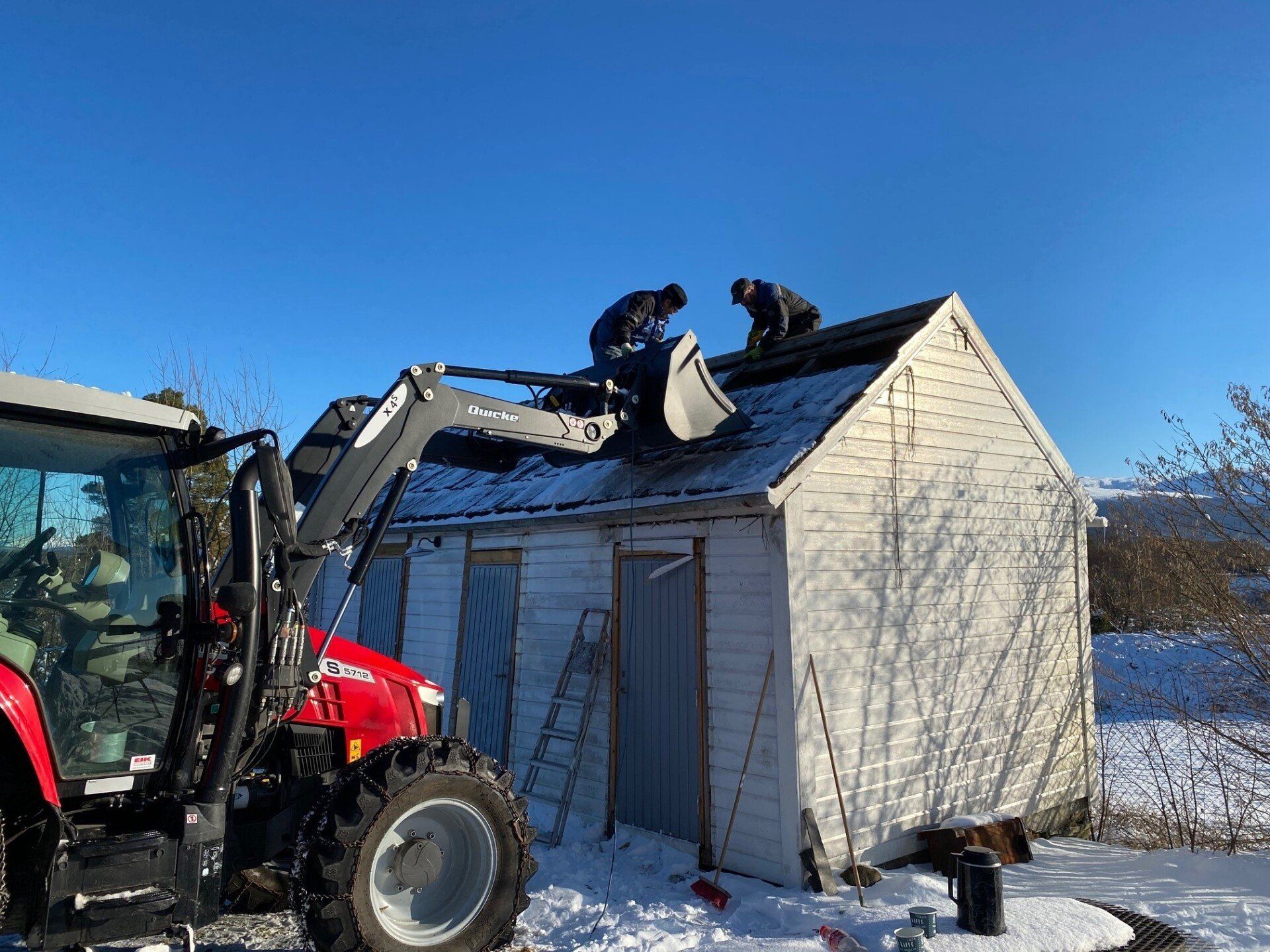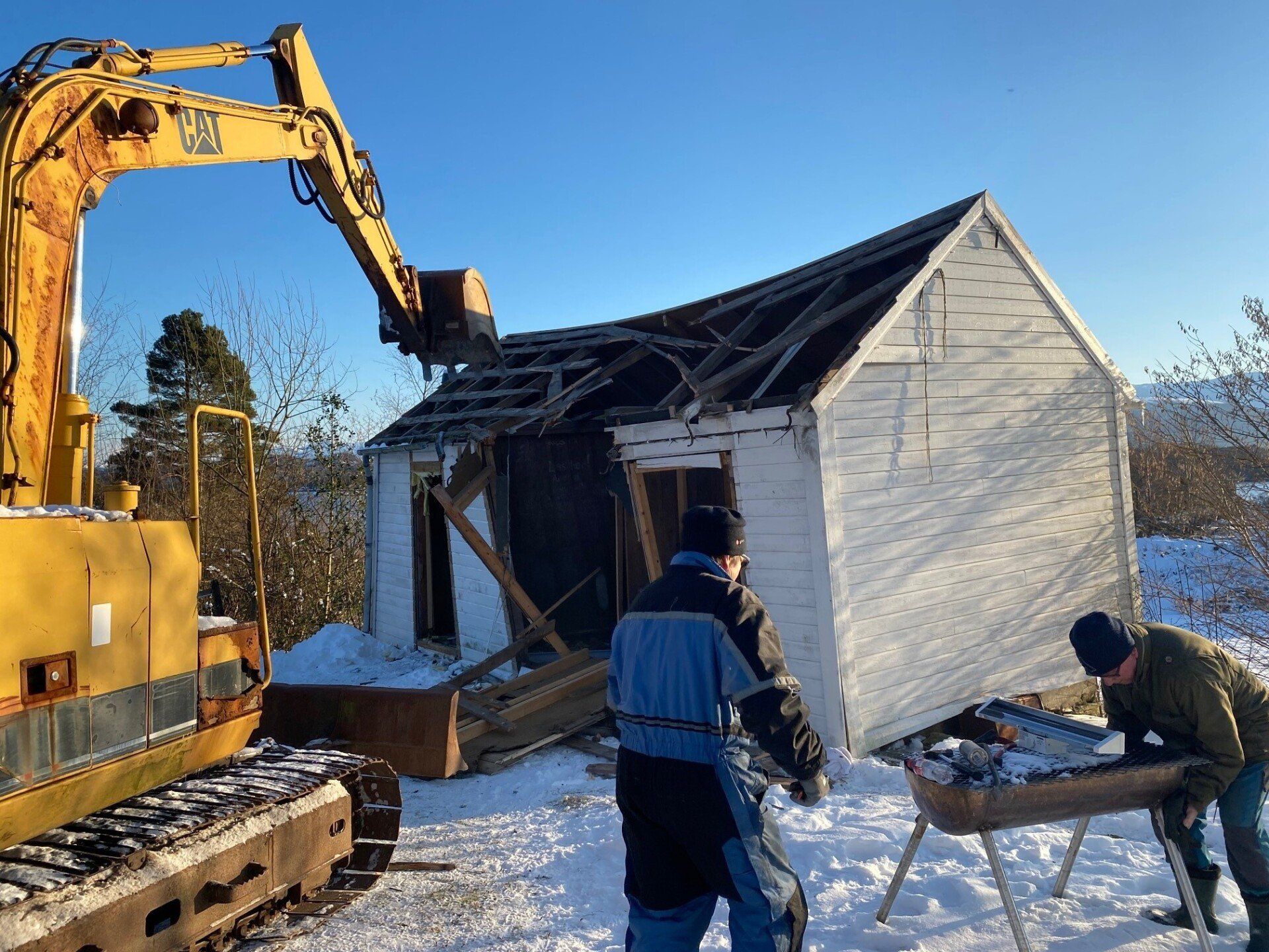 20.november i fjor blei grendahuset ramma av eit lynnedslag som øydela uthuset og det elektriske anlegget fullstendig, samt fleire glassruter blei sprengt. Vi fikk skadene i skulehuset dekt av forsikringa, men uthuset var ikkje dekka. Vi hadde ekstra generalforsamling kor det blei bestemt at vi skulle bygge nytt uthus på dugnad. Vi skulle felle dei store granene og bruka dei til å lage reisverk. Arbeidet blei satt i gong i vinteren 2021 og det gamle uthuset blei revet.